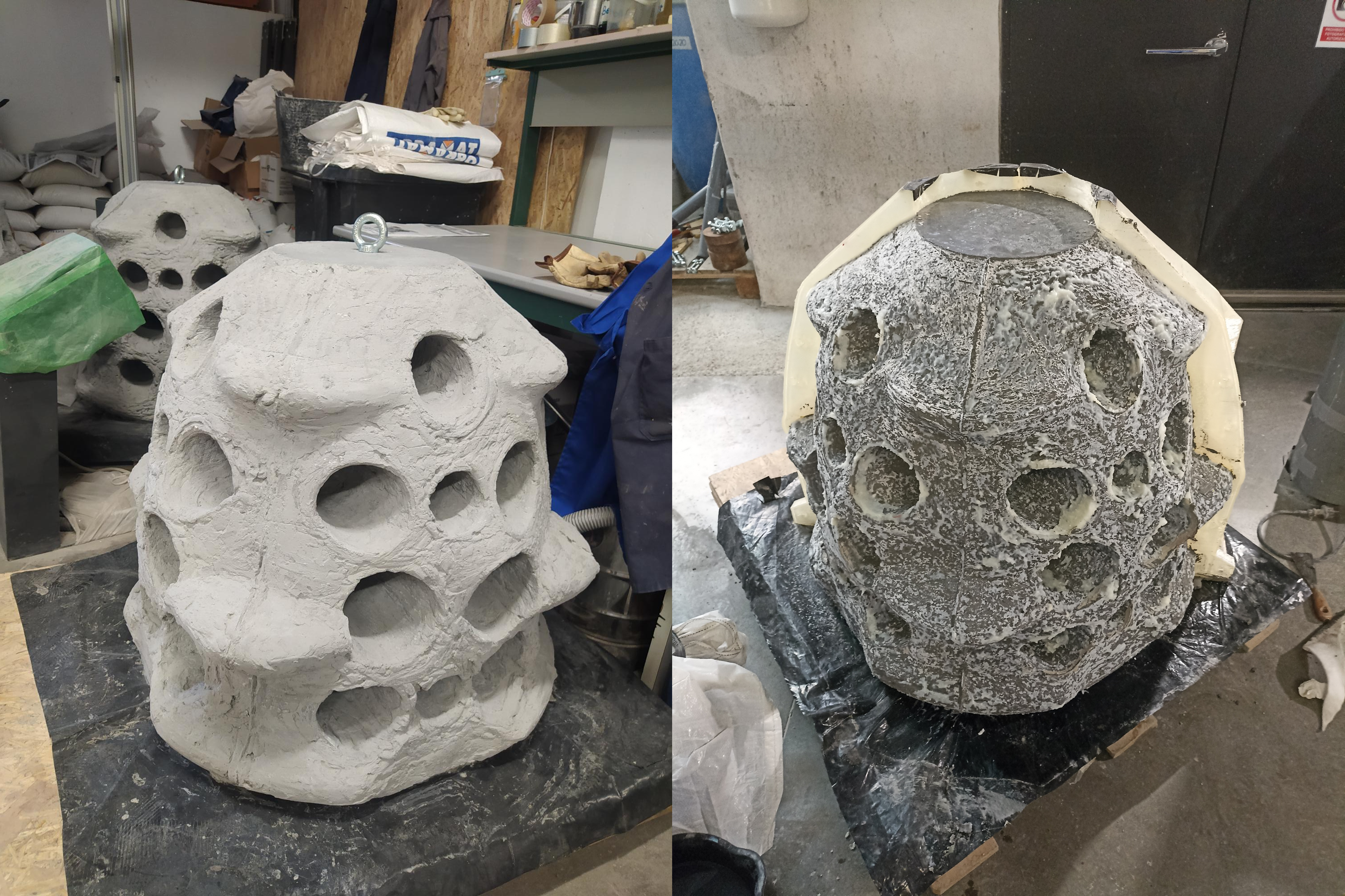 Two artificial reefs have been built using a 3D-printed PLA formwork. One of the reefs was made with a low-clinker cement mortar (left) and the other with a geopolymer mortar (right).